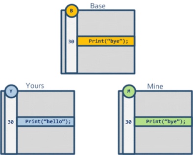 Yours 分支上的代码修改了文件,因此合并之后的文件中的内容采用这个分支上修改的内容。会不会出现三个文件上相同的文件修改的内容都不相同的情况呢 ? 会的,这种情况的出现就是我们合并中会遇到的 冲突